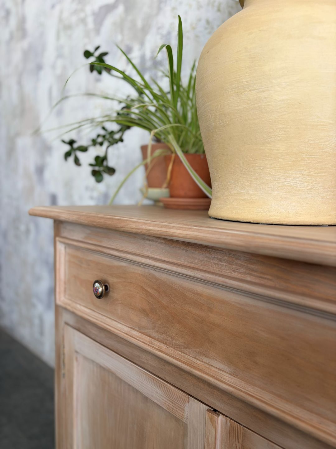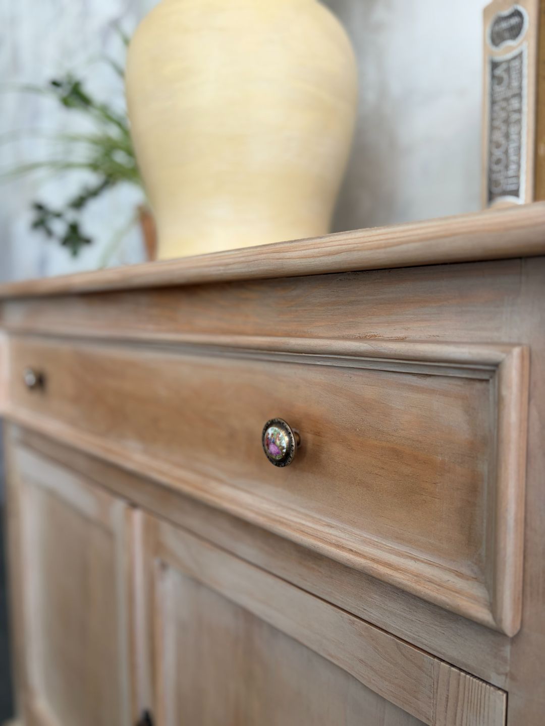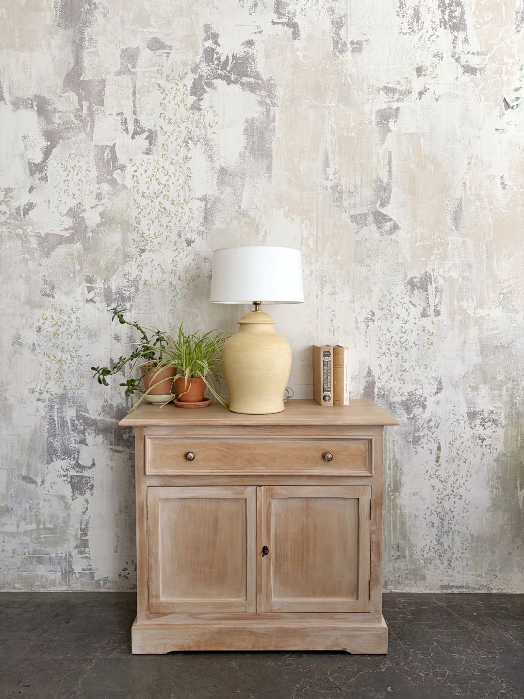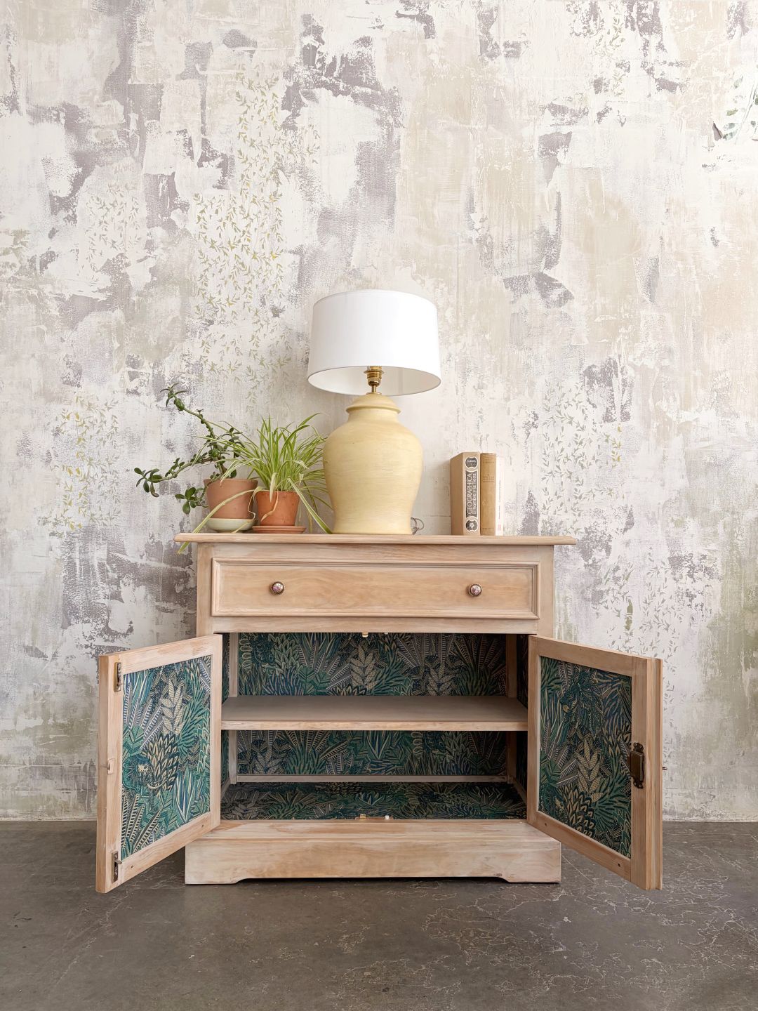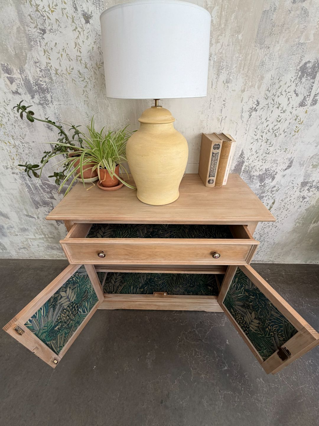 Elegante aparador de dos puertas en madera natural y pátina blanca e interior empapelado de líneas rectas y sencillas. Colores y acabados personalizados.