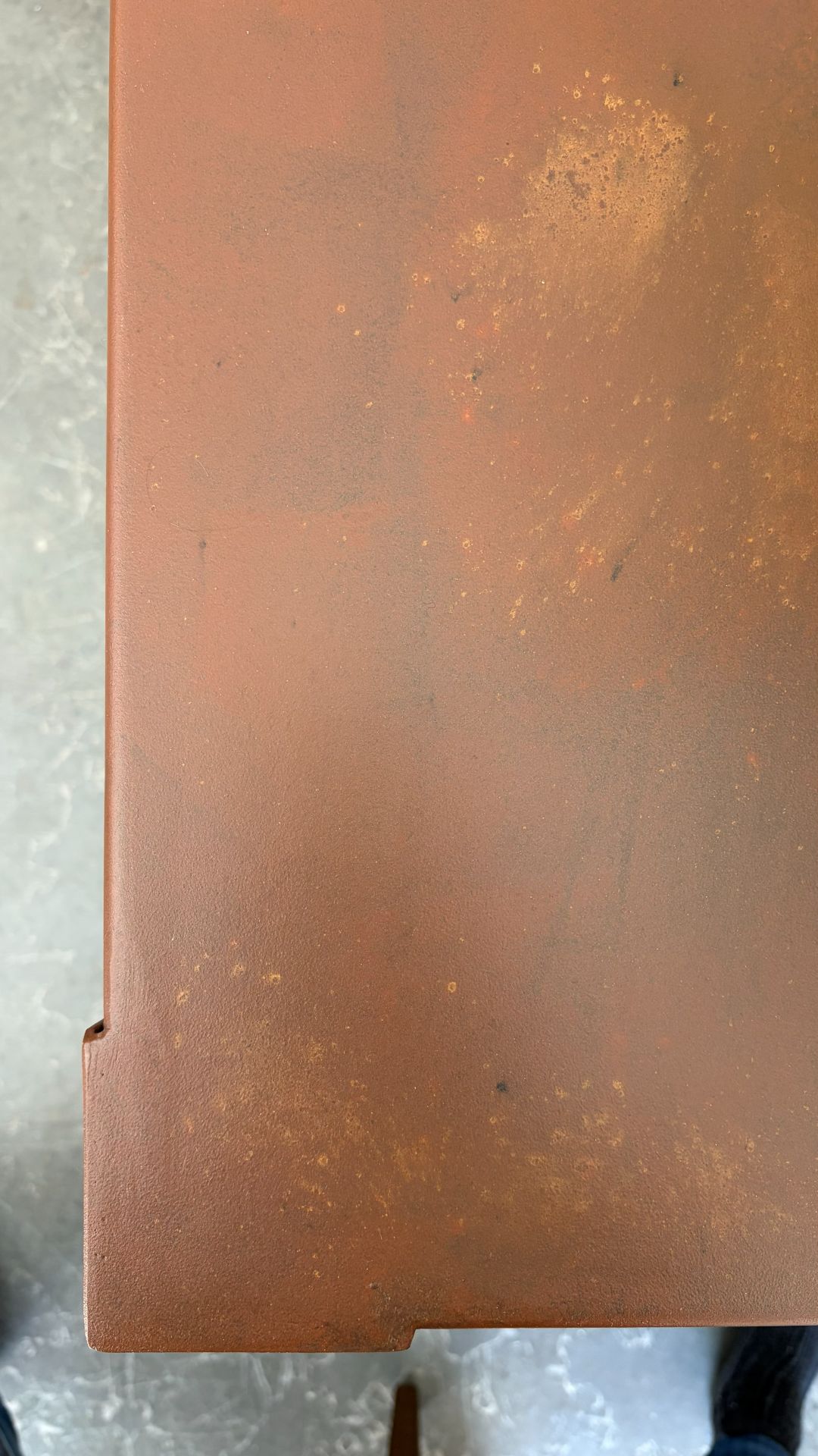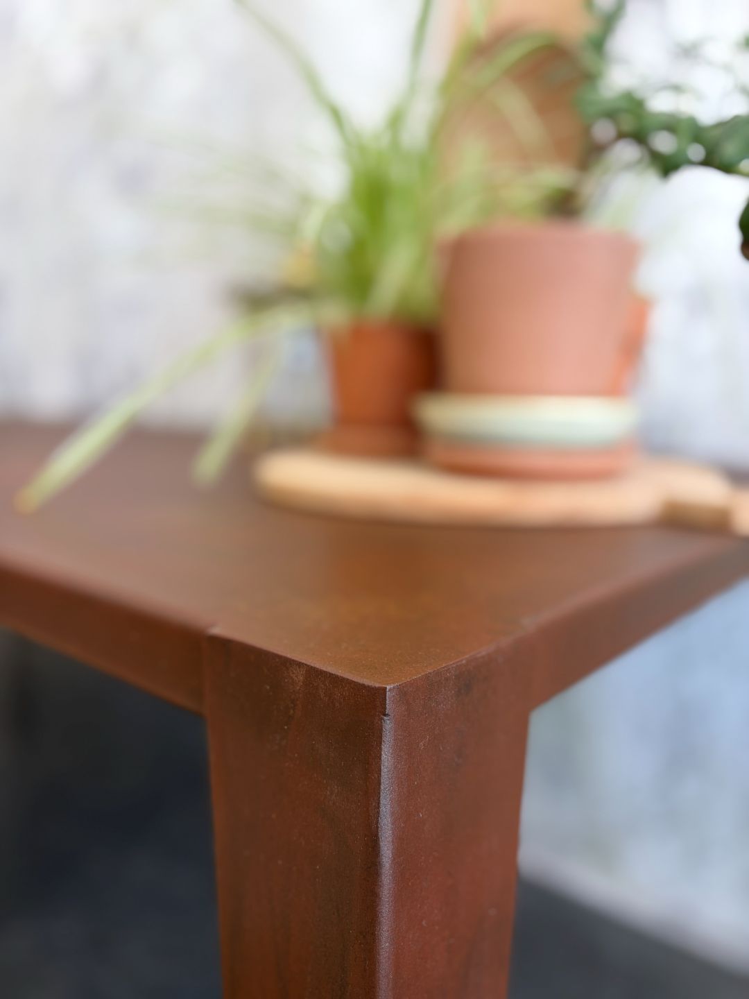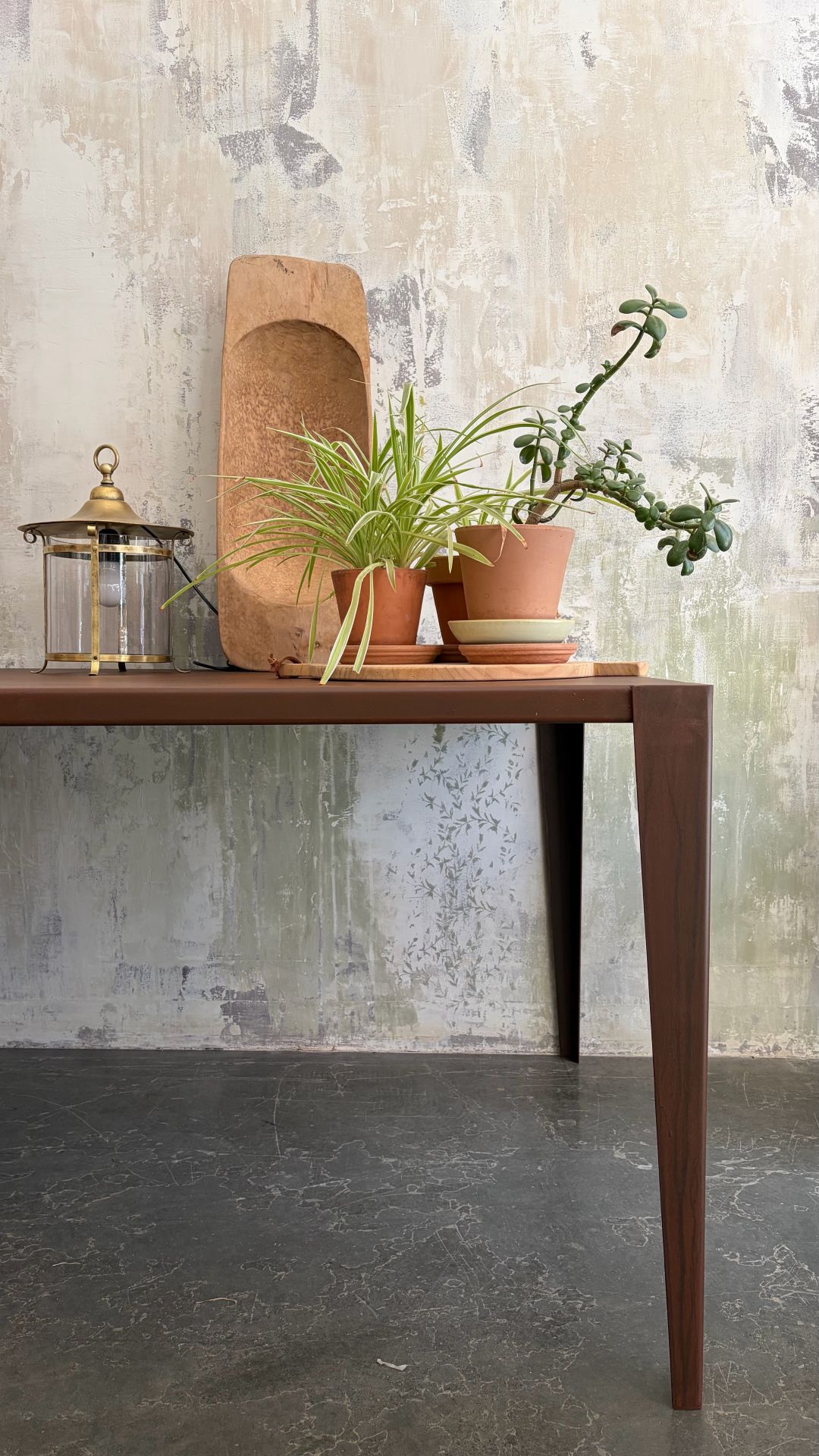 Mesa de chapa de acero plegado con acabado de pátina natural óxido.