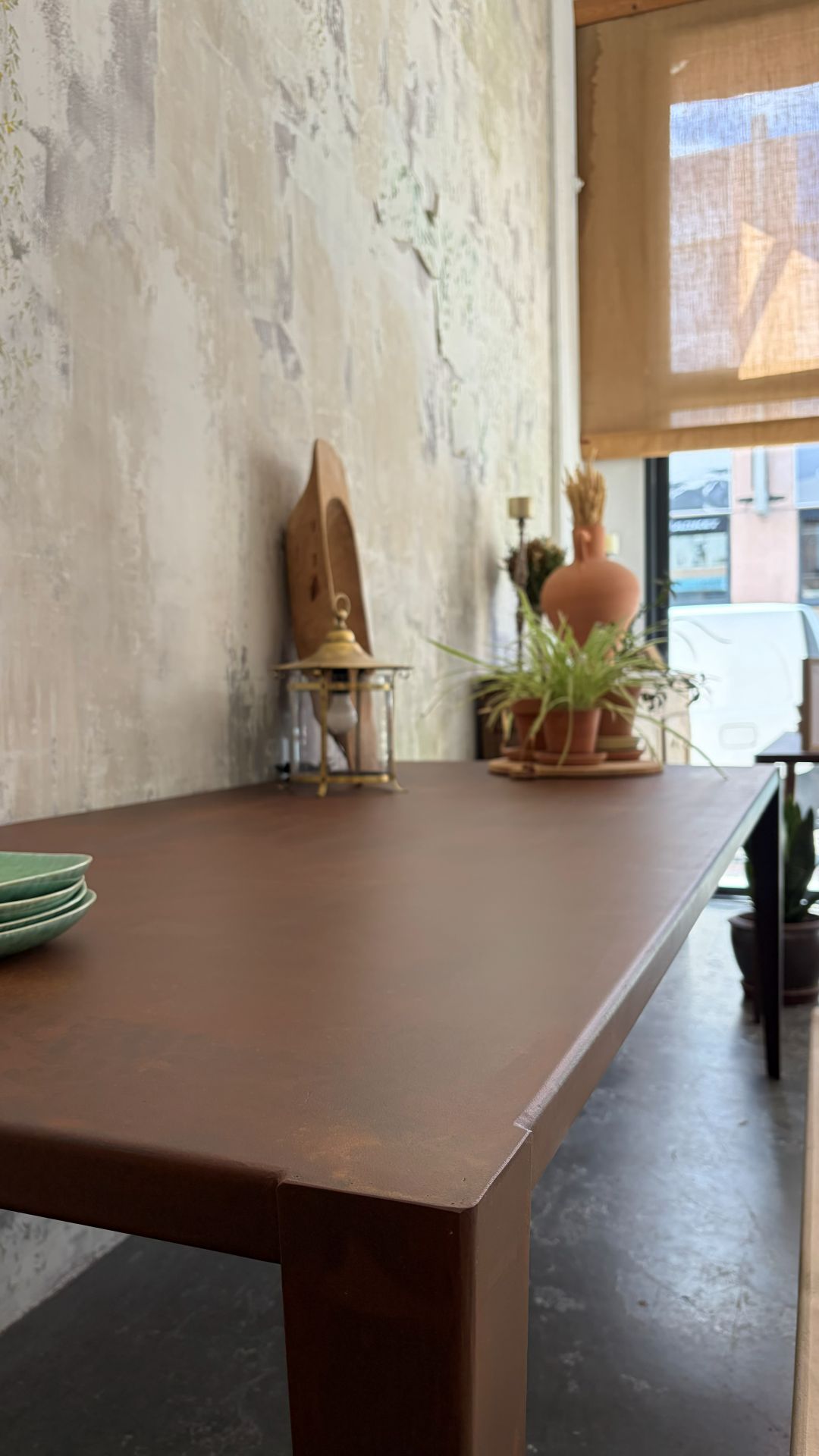 Mesa a medida de chapa de acero plegada con acabado patinado